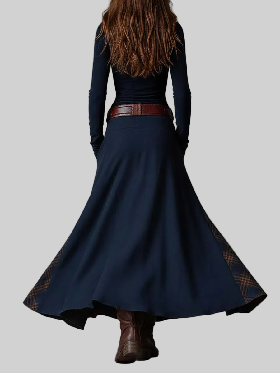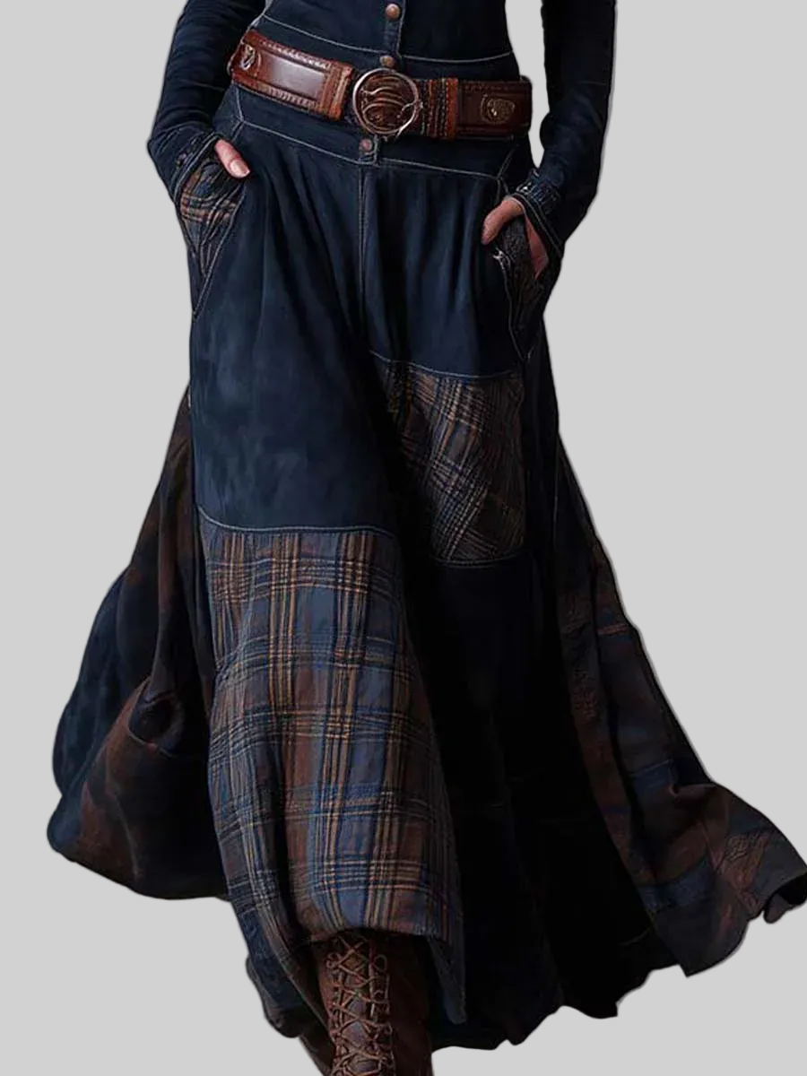 La robe Camille combine la force du style vintage avec une élégance bohème intemporelle. Confectionnée en daim écologique bleu marine et avec des panneaux à carreaux dans des tons terre, cette pièce associe textures et mouvement dans un design qui se distingue par son caractère artisanal.
