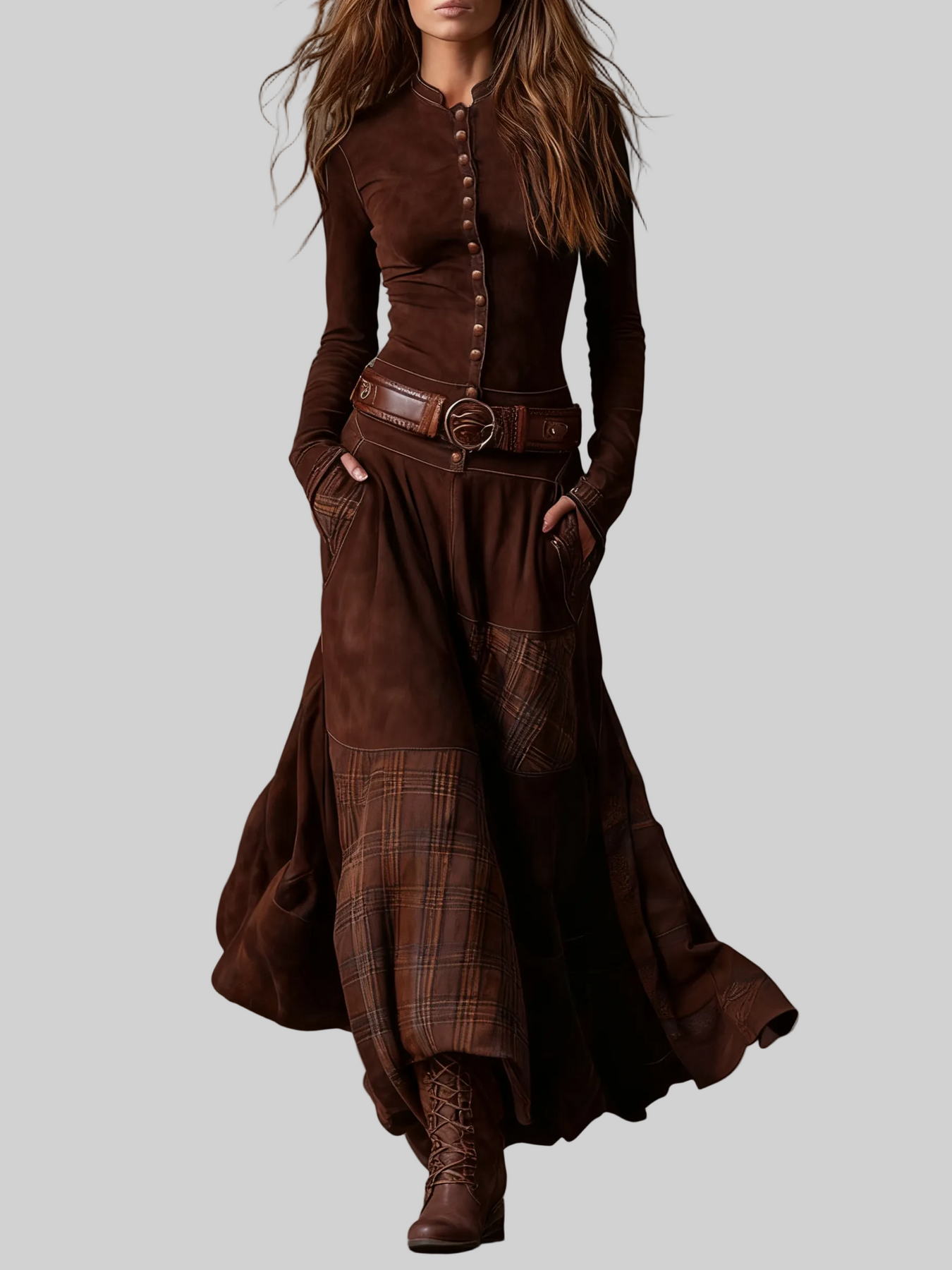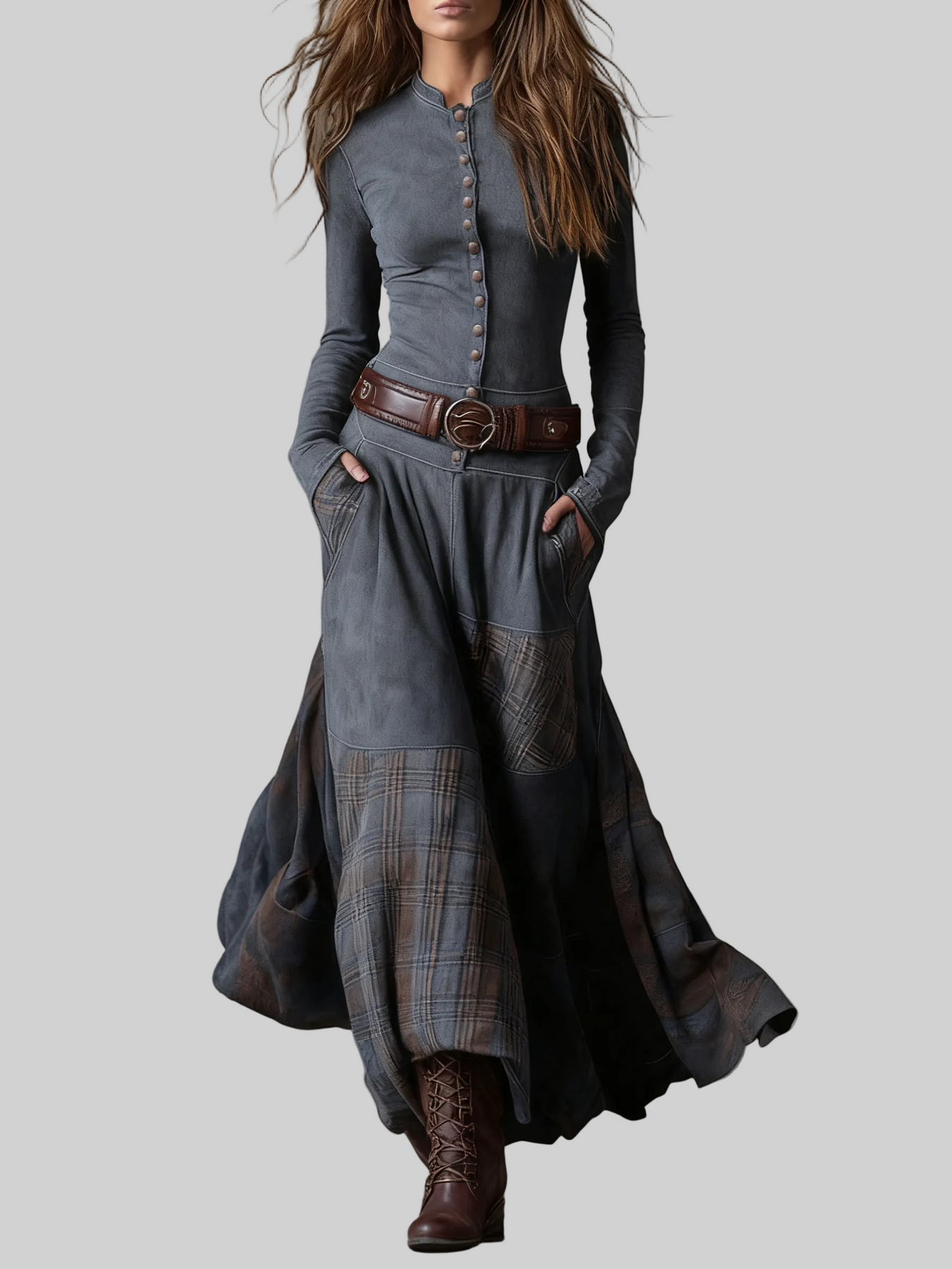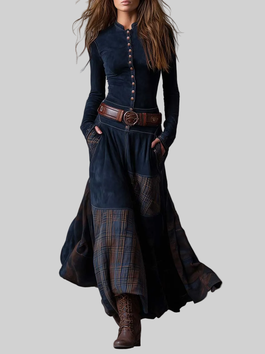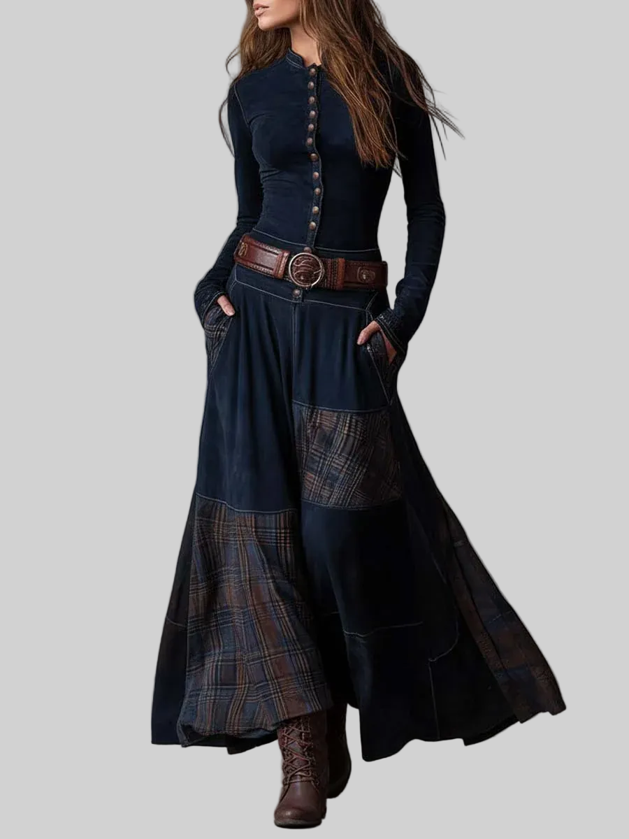 Son corsage ajusté avec boutons métalliques met en valeur la silhouette, tandis que la jupe fluide en patchwork apporte dynamisme et charme à chaque pas. Une robe conçue pour les femmes au cœur libre et au goût pour la distinction.