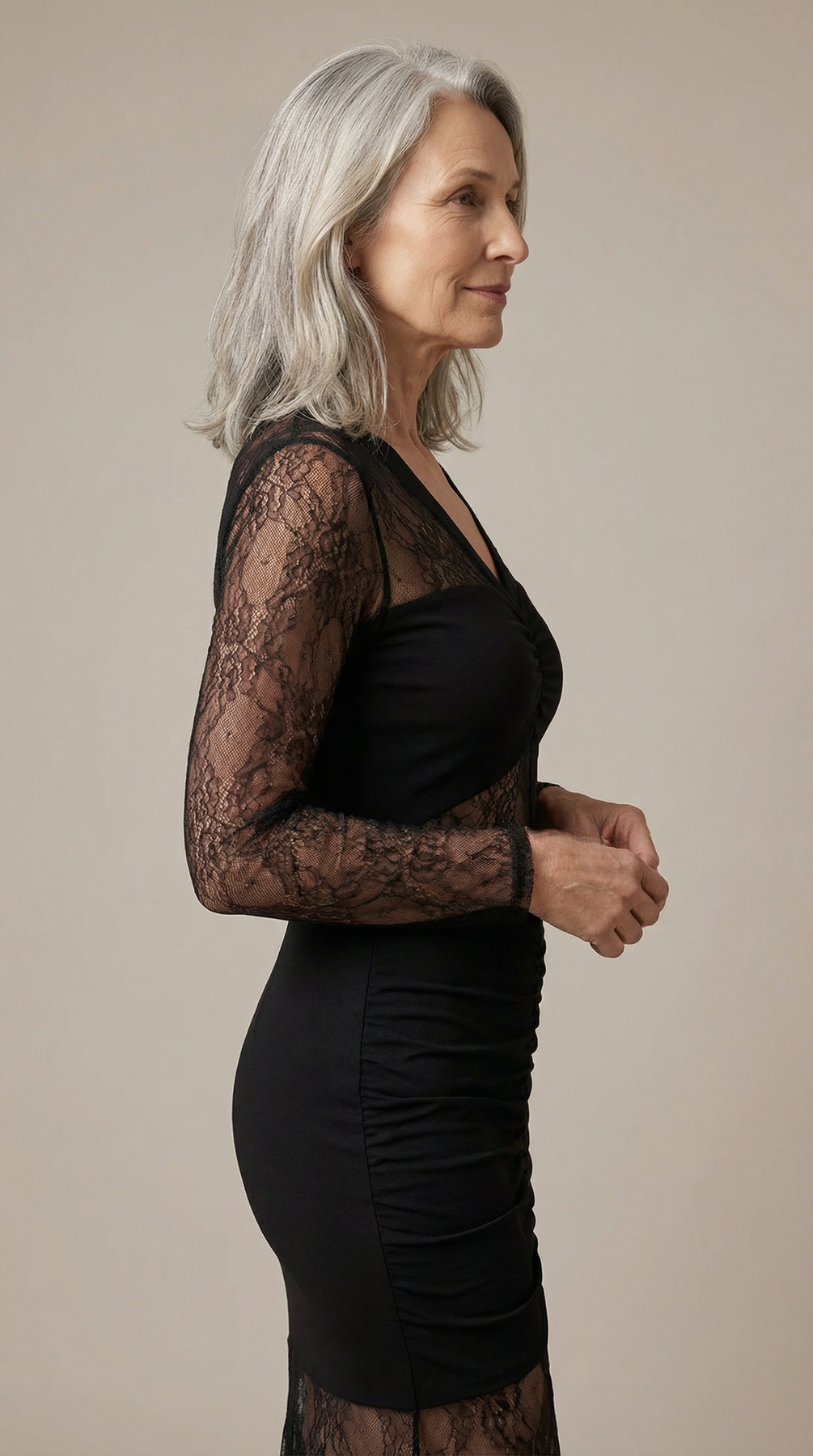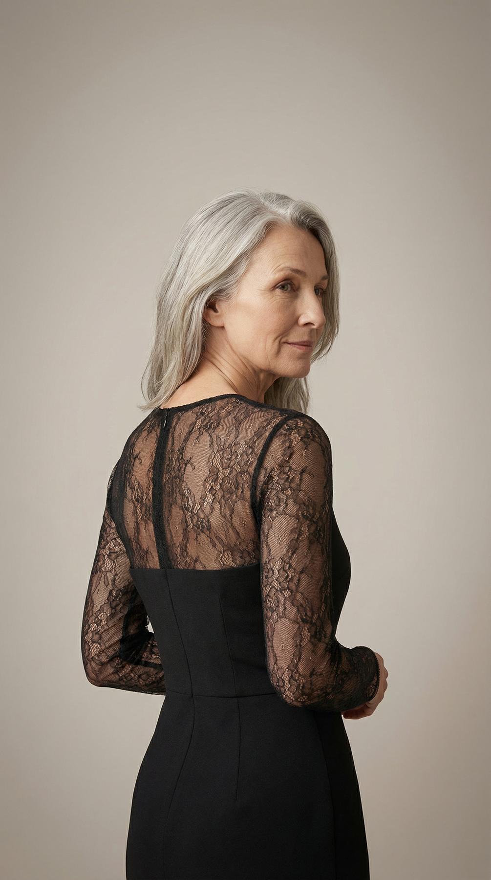 Pensée pour sublimer les formes naturelles sans contrainte, cette robe offre une allure confiante et harmonieuse. Le contraste entre la dentelle légère et les zones plus couvrantes crée un style sophistiqué, à la fois séduisant et élégant, idéal pour les occasions où l’on souhaite se sentir belle et assurée.