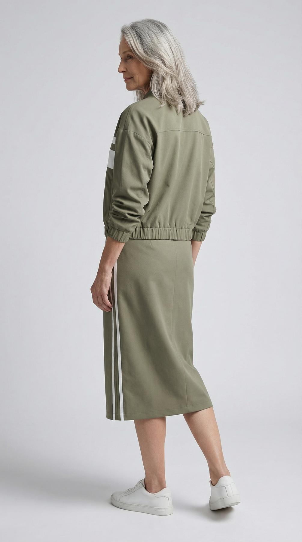 Alliant allure sportive et silhouette raffinée, cet ensemble deux pièces séduit par son équilibre parfait entre décontraction et sophistication. La veste bomber légère apporte une touche contemporaine et dynamique, tandis que la jupe moulante longueur genou structure la silhouette avec élégance.