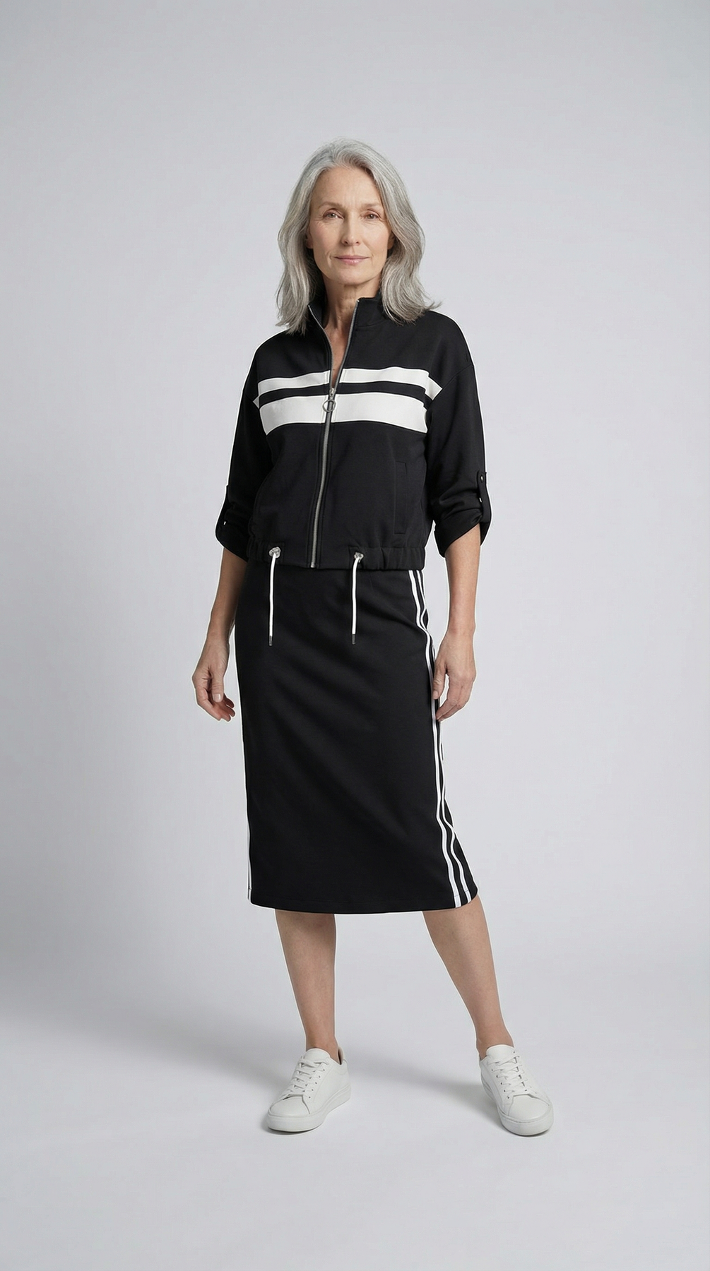 Les accents à rayures contrastées insufflent une note sportive moderne, subtilement intégrée au design pour un style affirmé sans excès. La coupe flatteuse de la jupe épouse naturellement les courbes, créant une allure féminine et harmonieuse tout en garantissant une liberté de mouvement agréable.