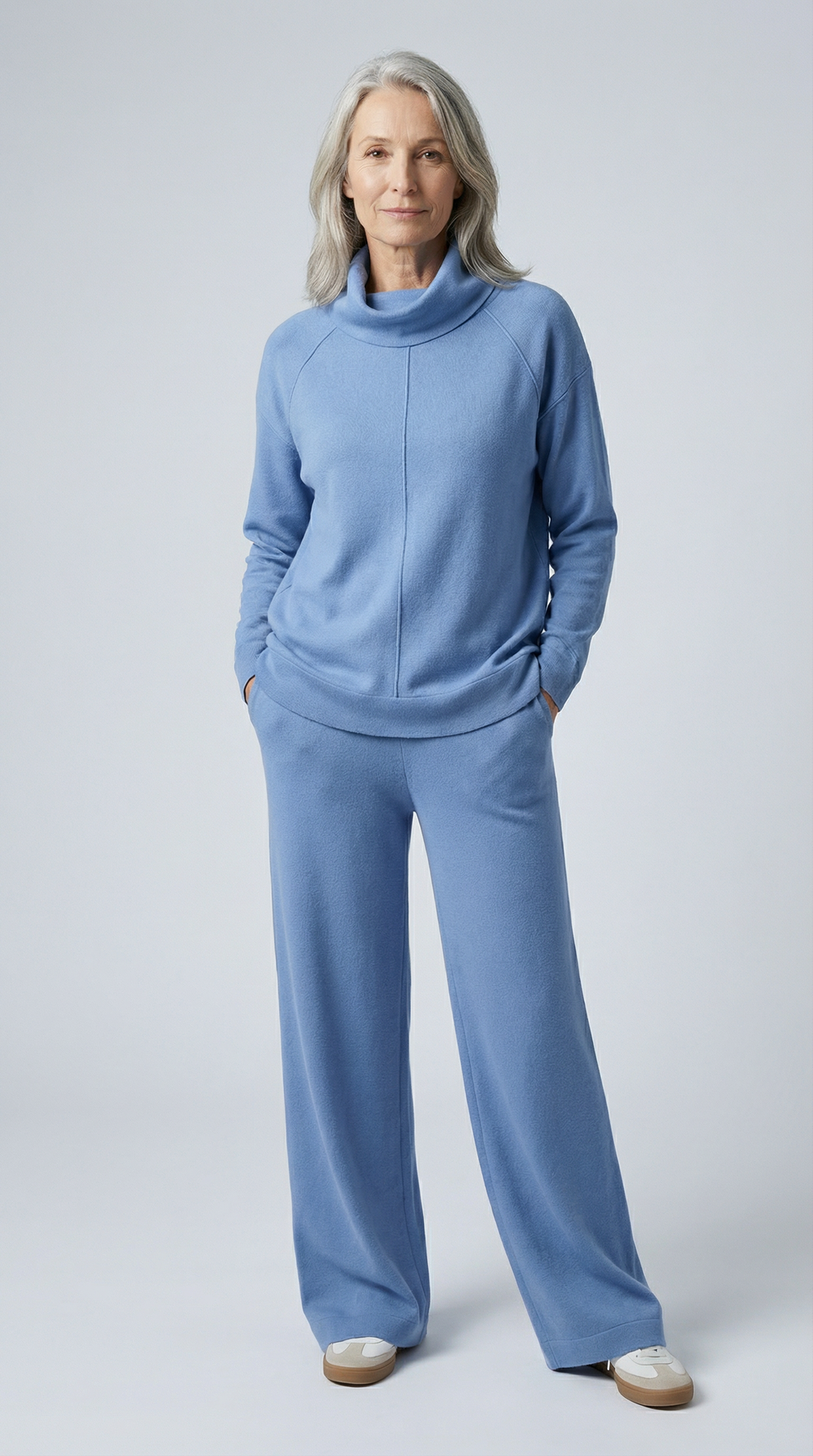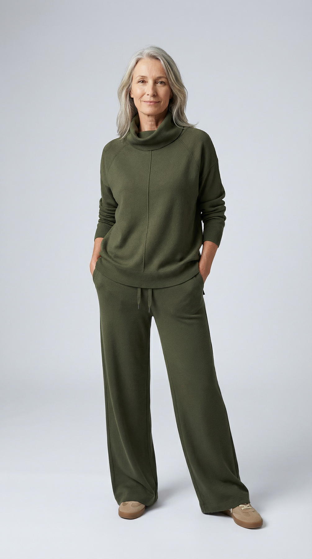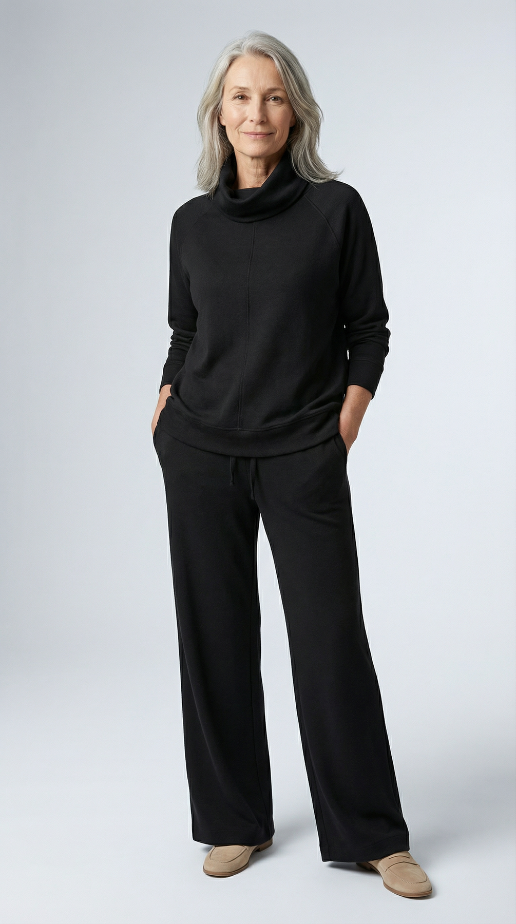 Le haut à col montant apporte une chaleur douce lors des journées plus fraîches, tout en restant respirant. La fente latérale discrète facilite les mouvements et renforce le confort, que ce soit à la maison ou lors de courtes sorties. Le pantalon assorti, légèrement extensible, permet de s’asseoir, de bouger et de s’étirer sans contrainte.