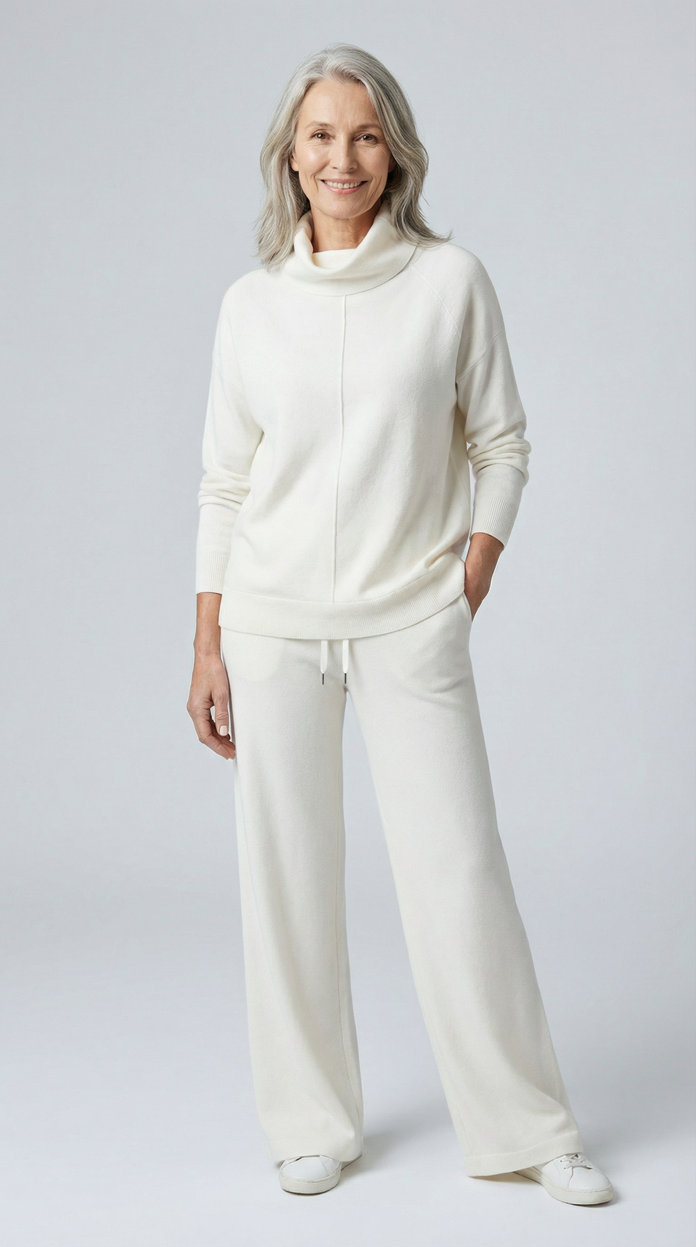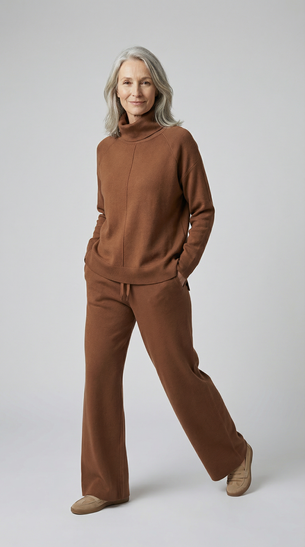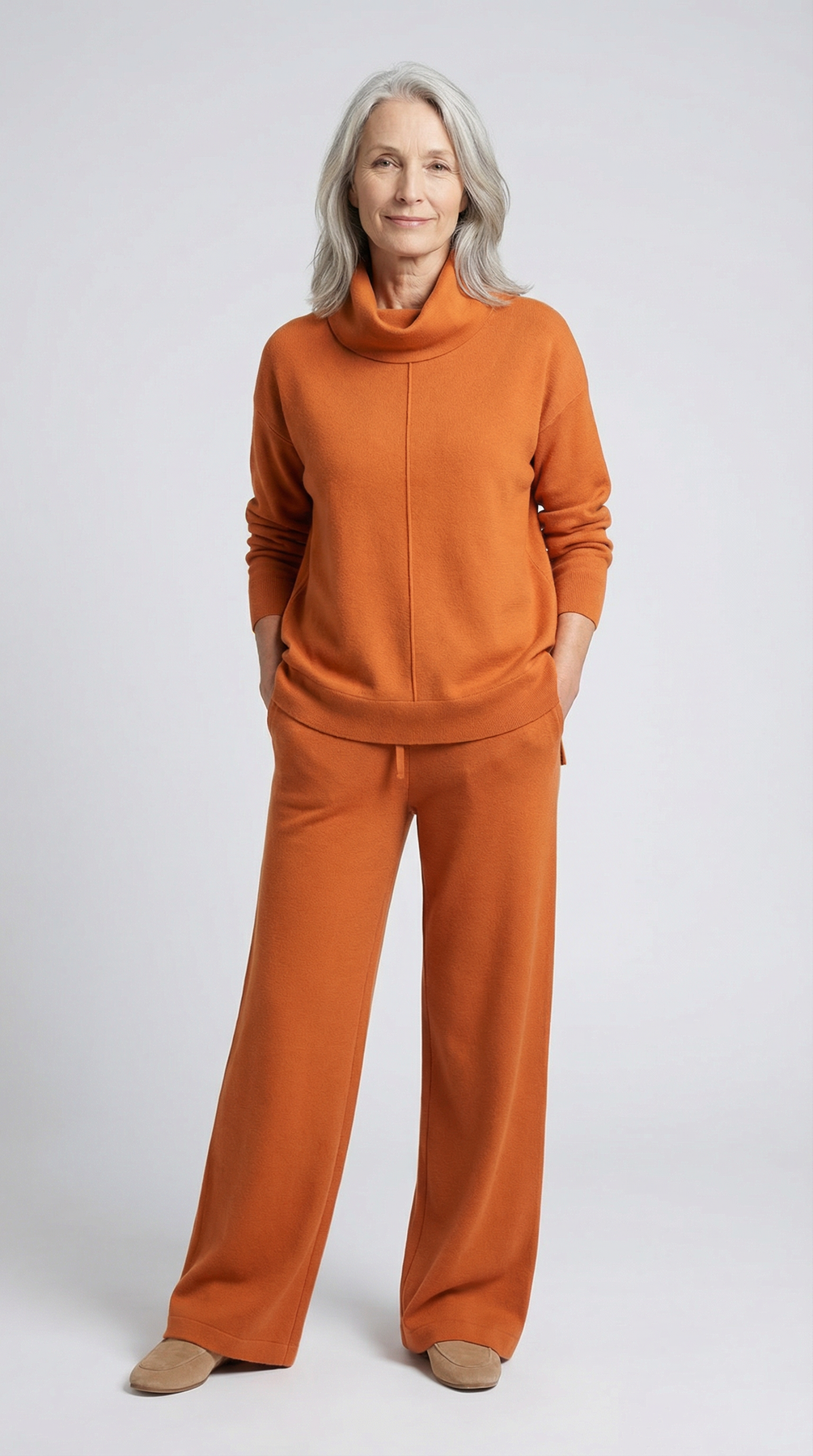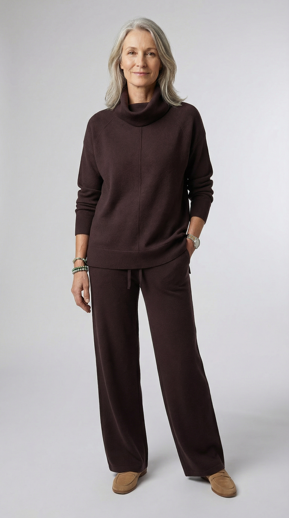 Le haut à col montant apporte une chaleur douce lors des journées plus fraîches, tout en restant respirant. La fente latérale discrète facilite les mouvements et renforce le confort, que ce soit à la maison ou lors de courtes sorties. Le pantalon assorti, légèrement extensible, permet de s’asseoir, de bouger et de s’étirer sans contrainte.